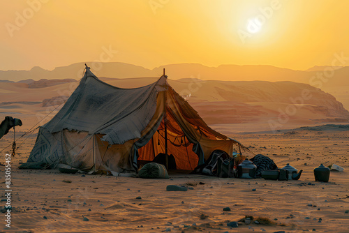 Desert Camping Tent at Sunset Overlooking Dunes and Rugged Terrain in Sahara with Vibrant Colorful Sky