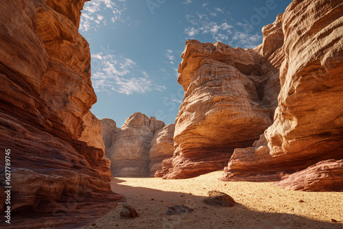 Desert canyon landscape with layered rock formations, warm afternoon light