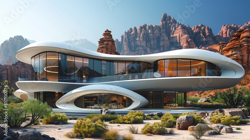 Desert Oasis: Futuristic Curvilinear Architecture Amidst Rugged Red Rocks