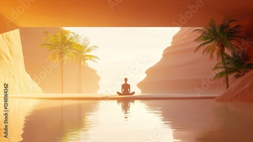 Desert Oasis Serenity, meditative figure seated by a secluded desert oasis, warm sunlight illuminating tranquil water, minimalist dunes and palm trees creating a peaceful atmosphere.