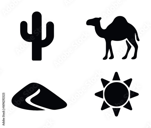 Desert symbols: cactus, camel, sand dune, and sun icons in black silhouette style