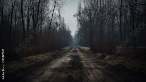 Deserted dark forest road. AI generated.