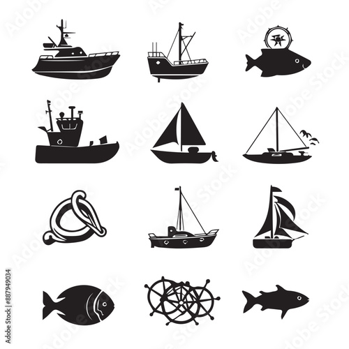 Design very stylish black pictograms that represent ship items icon set.flat. Simple. White background.