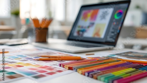Designer's workspace Color palettes, pencils, laptop screen displaying design project, office background