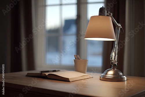 Desk lamp illuminates open book and notepad