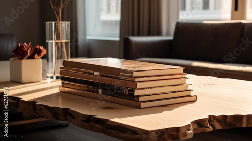 Desk with volume of new books. Edges or book stacks one on top of the other. Table with books. Office with elegant, luxurious and minimalist wooden table.