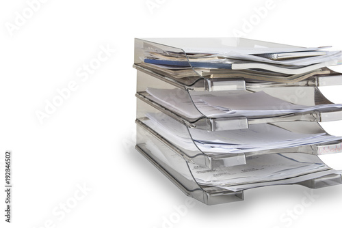 Desktop filing drawers full of papers on the white. Paper office tray.