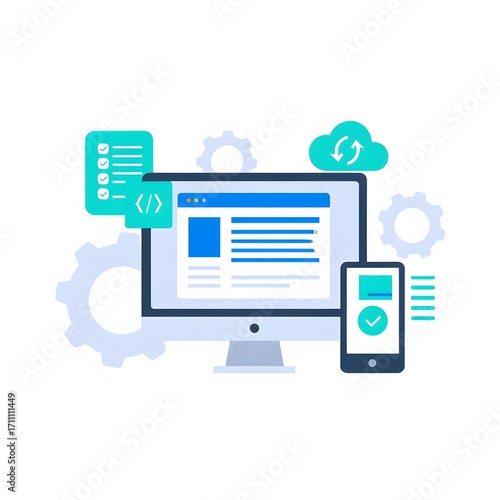 Desktop smartphone app development, cloud computing network concept. Coding, programming 3d render illustration isolated on transparent background