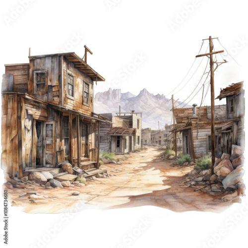 Desolate Western Ghost Town Street, Dilapidated Buildings, Arid Landscape