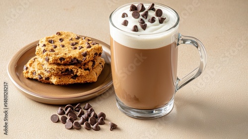 Dessert flat lay with chocolate chips and creamy mocha on tan surface