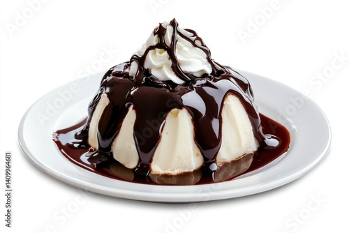 Dessert with cream and chocolate sauce on a white plate isolated.