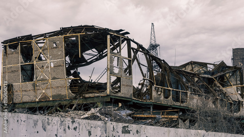 destroyed and burned factory buildings in the city in Ukraine