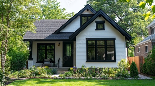 Detached new-build residence featuring a pitched roof, white siding, and black trim spacious front yard with vibrant greenery.
