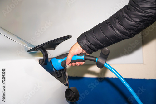 Detail of a man's hand with the electric car charger, in a public charger in a parking lot