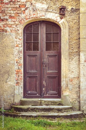 Detail of antique architecture. Wooden door to an old tenement house.