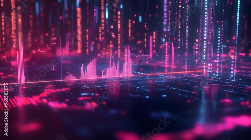 Detailed 3D illustration of abstract data analysis, charts and graphs in a digital space with neon accents, cool lighting with high contrast, sleek and futuristic atmosphere