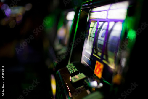 Detailed 4K Ultra HD Image of Casino Slot Machines with Shallow Depth of Field