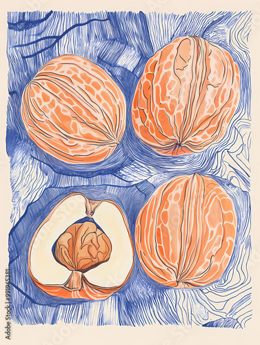 Detailed artistic illustration of walnuts