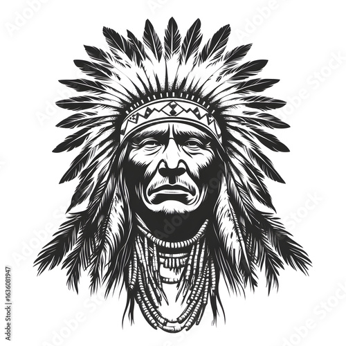 Detailed black and white tribal vector of Native American chief, adorned with feathers, celebrating cultural heritage and ancestral warrior spirit