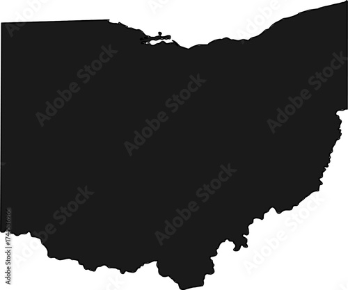 Detailed black vector silhouette map of the State of Ohio, a Midwestern U.S. state, providing a solid fill without internal divisions for design and data visualization.