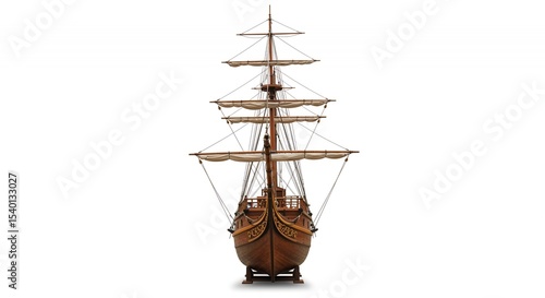 Detailed Brown Wooden Ship Model with Intricate Rigging on White Background