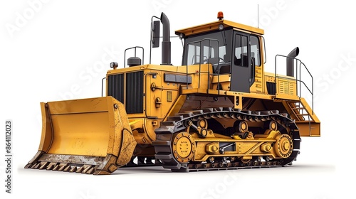 Detailed bulldozer with hydraulic system, isolated on white, construction equipment