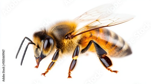 Detailed Close Up View of a Honeybee Insect with Compound Eyes Legs and Wings Against a White Background