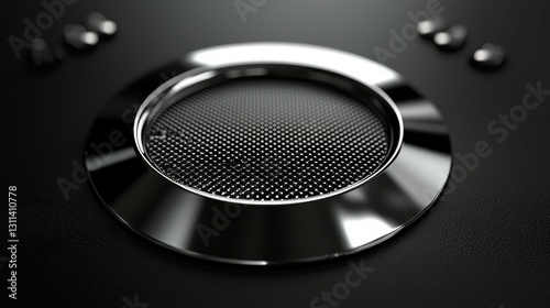 Detailed Close-Up of a Circular Metal Grate with Reflective Surface and Water Droplets on Dark Background