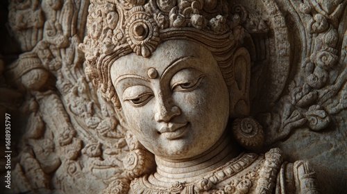 Detailed close-up of a serene, carved stone deity face, adorned with intricate headdress and decorative elements.