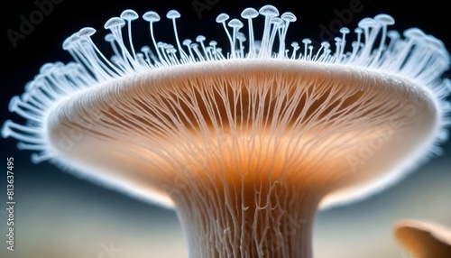Detailed close-up of a single mushroom against a dark black background, showcasing its intricate textures and unique features