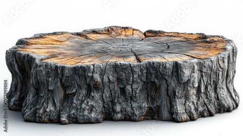 Detailed close-up of an ancient gray tree stump showcasing its textured bark and intricate growth rings on a plain white background