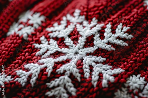 Detailed close-up of red and white knitted fabric featuring a snowflake pattern, perfect for winter and holiday-themed designs.