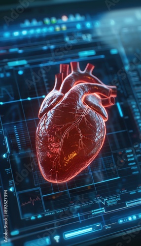 Detailed digital ing of a human heart with futuristic interface elements, emphasizing medical technology and cardiovascular health.