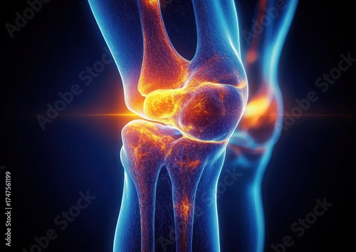 Detailed glowing digital visualization of human knee joints with highlighted bone structure and joint areas showing intricate internal anatomy in blue and orange hues