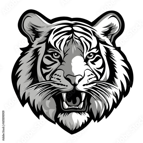 Detailed graphic of a tiger's head in monochrome.