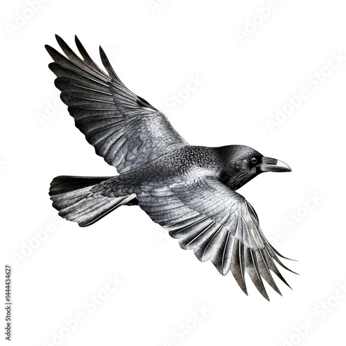 Detailed grayscale illustration of a bird in flight showcasing intricate feather patterns, dynamic wing positioning, and realistic anatomy, on a plain white background