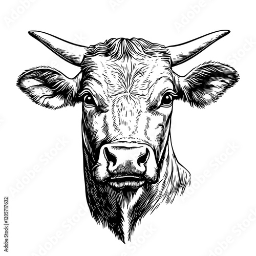 Detailed illustration of a cow head showcasing its features and expression in black and white style. Generative AI