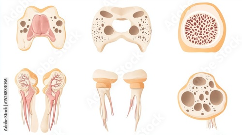 Detailed illustrations of human bones and joints showcasing their structural features and anatomy.