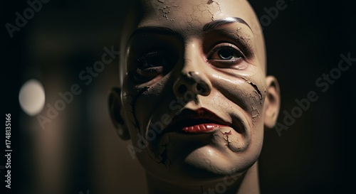 Detailed mannequin head with intricate facial details dramatic lighting and textures dark background