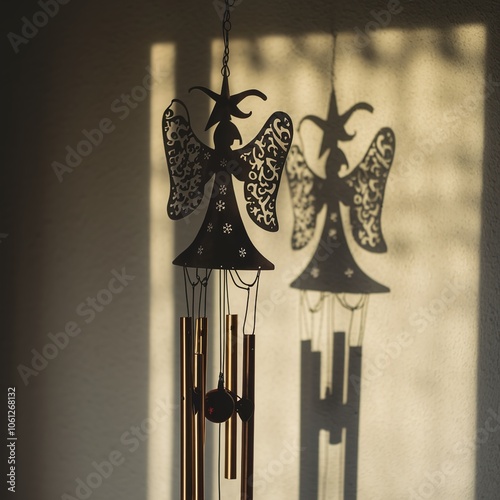 Detailed metal angel wind chime casting a dark, dramatic silhouette shadow on a warm interior wall bathed in golden sunlight.
