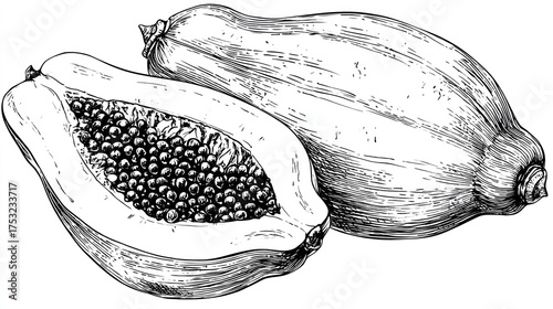 Detailed Papaya Illustration: Black and White Crosshatch, Seeds and Texture