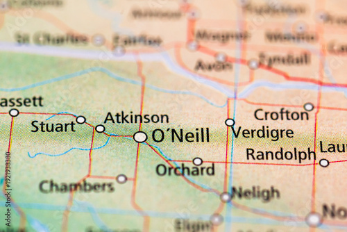 Detailed road map showing O Neill and surrounding towns in Nebraska.