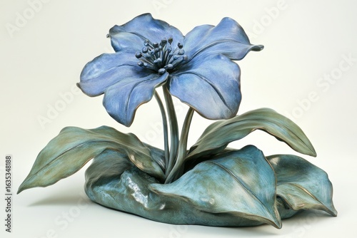 Detailed sculpture of a blue flower with green leaves.