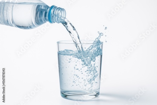 Detailed shot of crystal-clear water being poured from a bottle onto a plain white backdrop