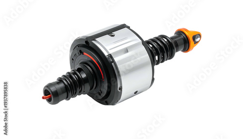 Detailed shot of industrial cylindrical mechanism with orange and black components
