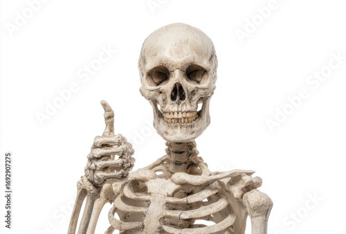 Detailed Skeleton Giving Thumbs Up Against White Background