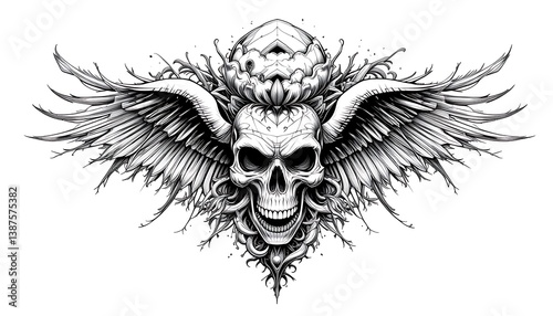 Detailed Skull with Wings and Crown Tattoo Style Black and White