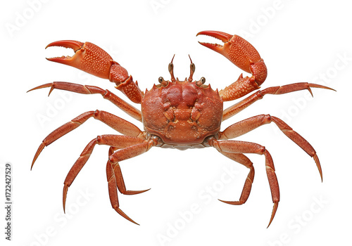 Detailed studio shot of a cooked orange crab, showcasing its textured shell, legs, and large claws on a pristine white background, ready for a culinary adventure.