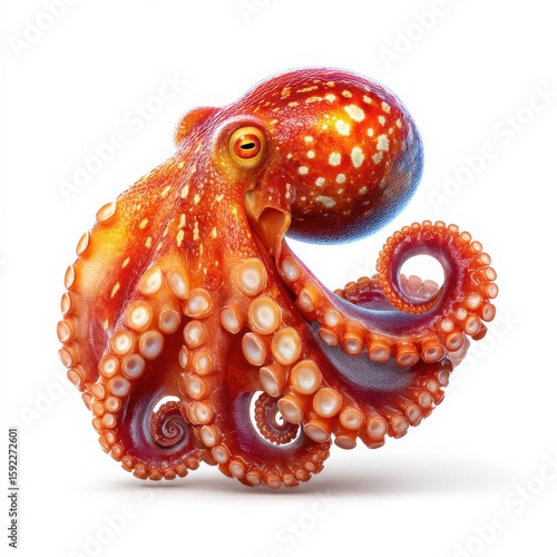 Detailed Studio Shot of a Vibrant Orange Octopus with White Spots Isolated on White Background, Featuring Intricate Tentacles and a Curious Eye,