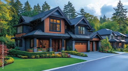 Detailed suburban neighborhood featuring large homes with landscaped lawns, shown on a clear background.